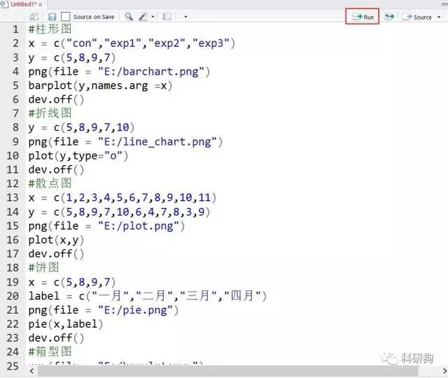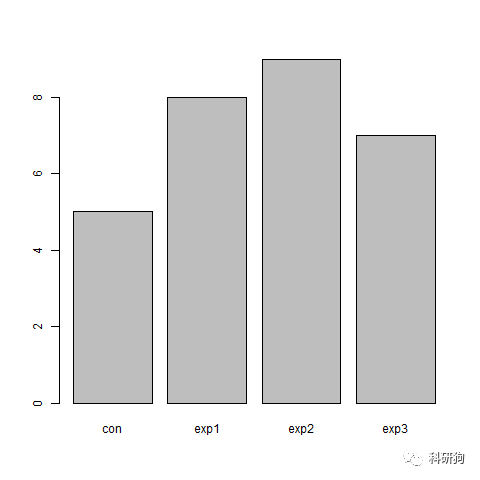 上面代码中,x和y可以理解为数字,x取值中con代表对照组,exp1-3代表三个实验组,y是对应的数值,然后使用绘制函数barplot()绘制,最后关闭并输出图片。