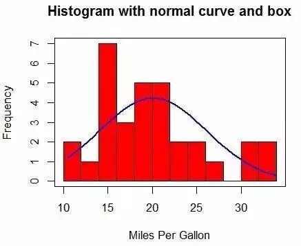 h<-hist(x,breaks=12,col="red",xlab="MilesPer Gallon",main="Histogram with normal curve and box")
