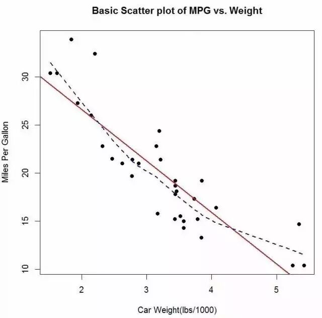 plot(wt,mpg,main="Basic Scatter plot of MPG vs. Weight",xlab="Car Weight (lbs/1000)",ylab="Miles Per Gallon",pch=19)
