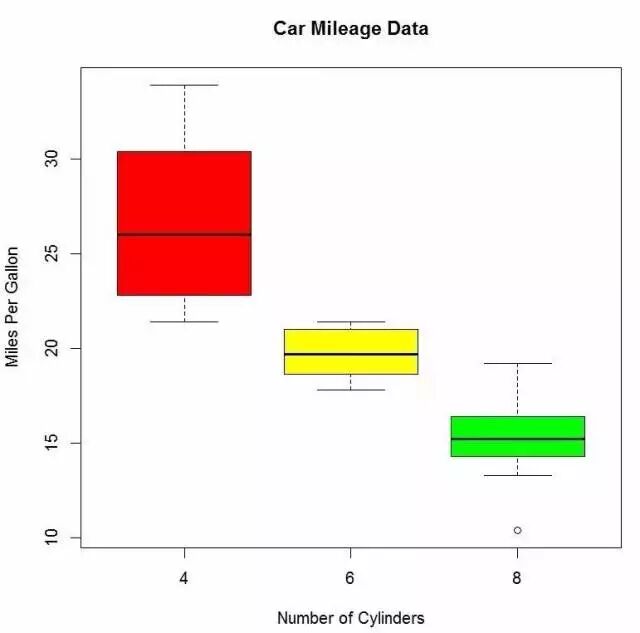 boxplot(mpg~cyl,data=mtcars,main="Car Mileage Data",xlab="Number of Cylinders", ylab="Miles Per Gallon",col=c("red","yellow","green"))