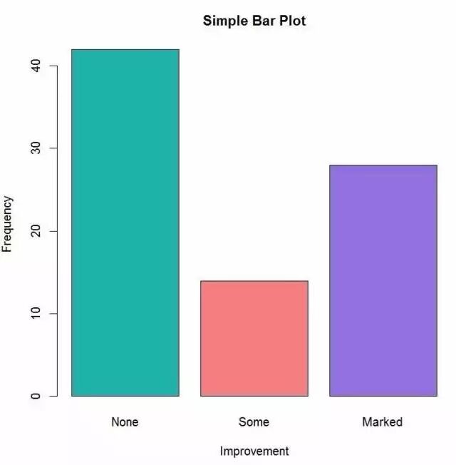 barplot(counts,main="Simple Bar Plot",xlab="Improvement",ylab="Frequency",col=c("lightseagreen", "lightcoral","mediumpurple"))