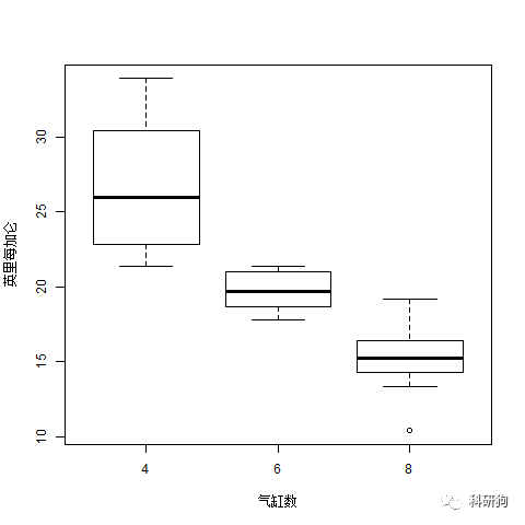 boxplot(mpg ~ cyl, data = mtcars, xlab = "气缸数",ylab = "英里每加仑")