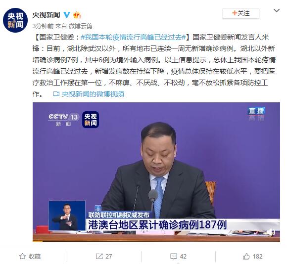 国家卫健委新闻发言人米锋:目前,湖北除武汉以外,所有地市已连续一周无新增确诊病例。湖北以外新增确诊病例7例,其中6例为境外输入病例。以上信息提示,总体上我国本轮疫情流行高峰已经过去,新增发病数在持续下降,疫情总体保持在较低水平,要把医疗救治工作摆在第一位,不麻痹、不厌战、不松劲,毫不放松抓紧各项防控工作。