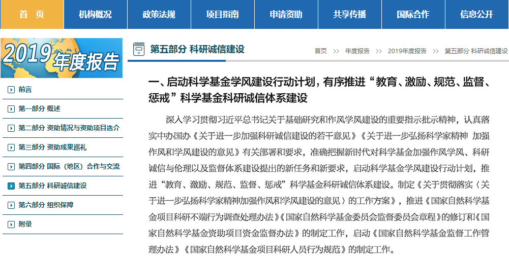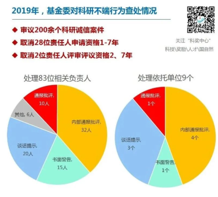 近日,国家自然科学基金网站更新了国家自然科学基金委2019年年度报告,根据报告的第五部分《科研诚信建设》:2019年自然科学基金委受理各类投诉举报问题线索、主动查处问题线索共489件。坚持把严肃查处科研不端行为作为科研诚信监督体系有效运行的最后手段,保持案件查处的高压态势,切实营造风清气正的科研环境。监督委员会对200余个科研诚信案件进行审议,提出处理建议。